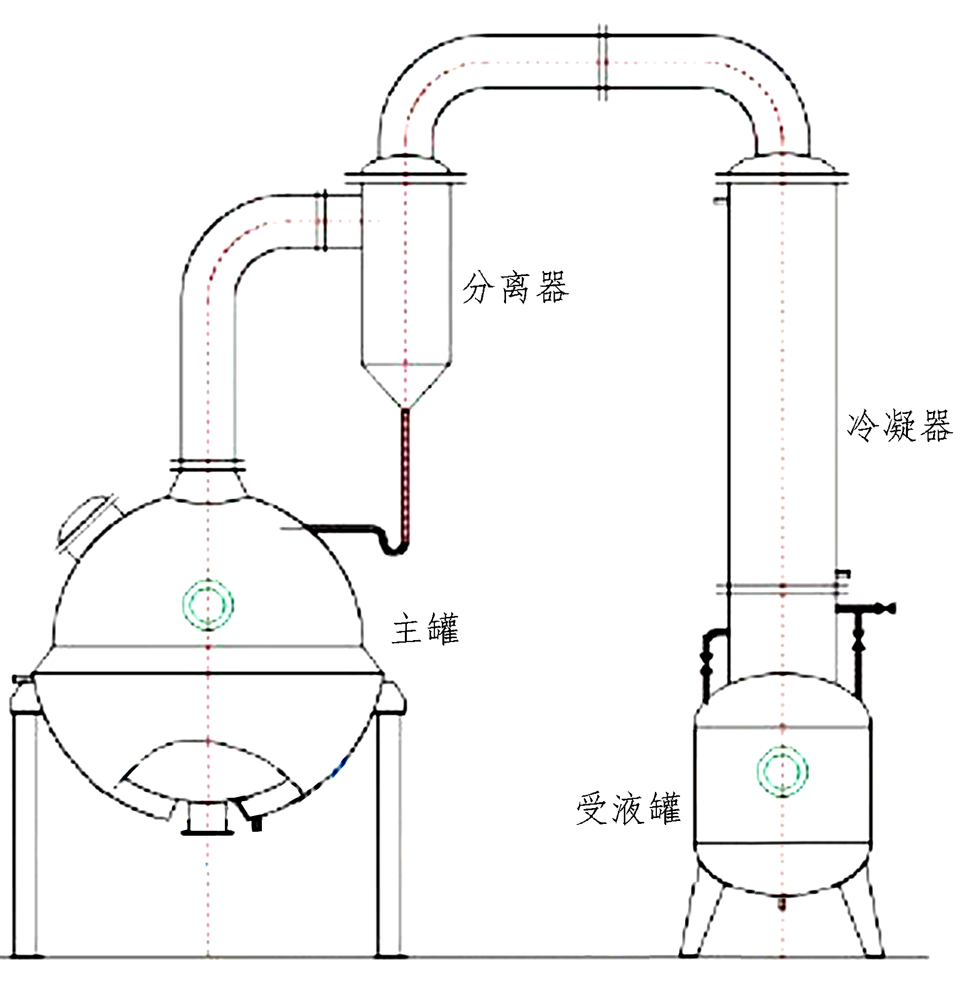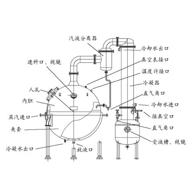球形濃縮罐主要由濃縮罐主體、冷凝器、氣液分離器、受液桶四個(gè)部分組成,可用于制藥、食品、化工等行業(yè)對料液的濃縮、蒸溜及有機(jī)溶